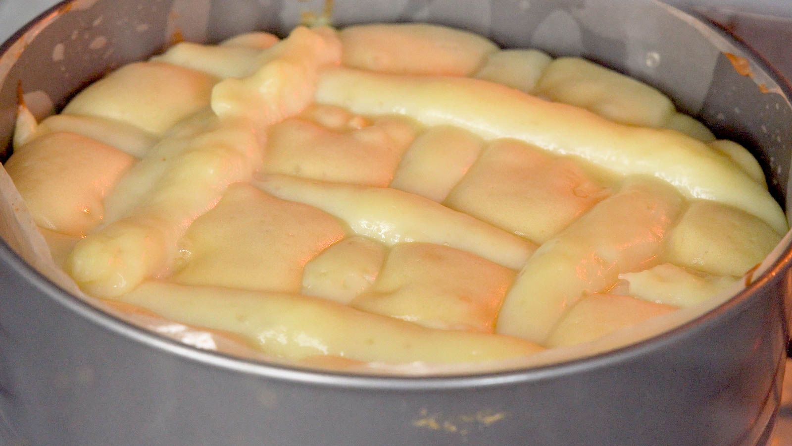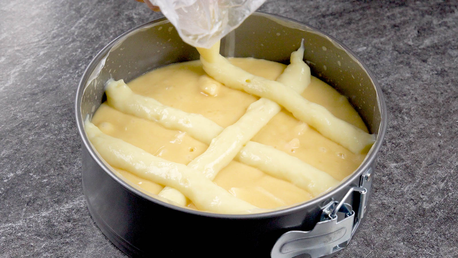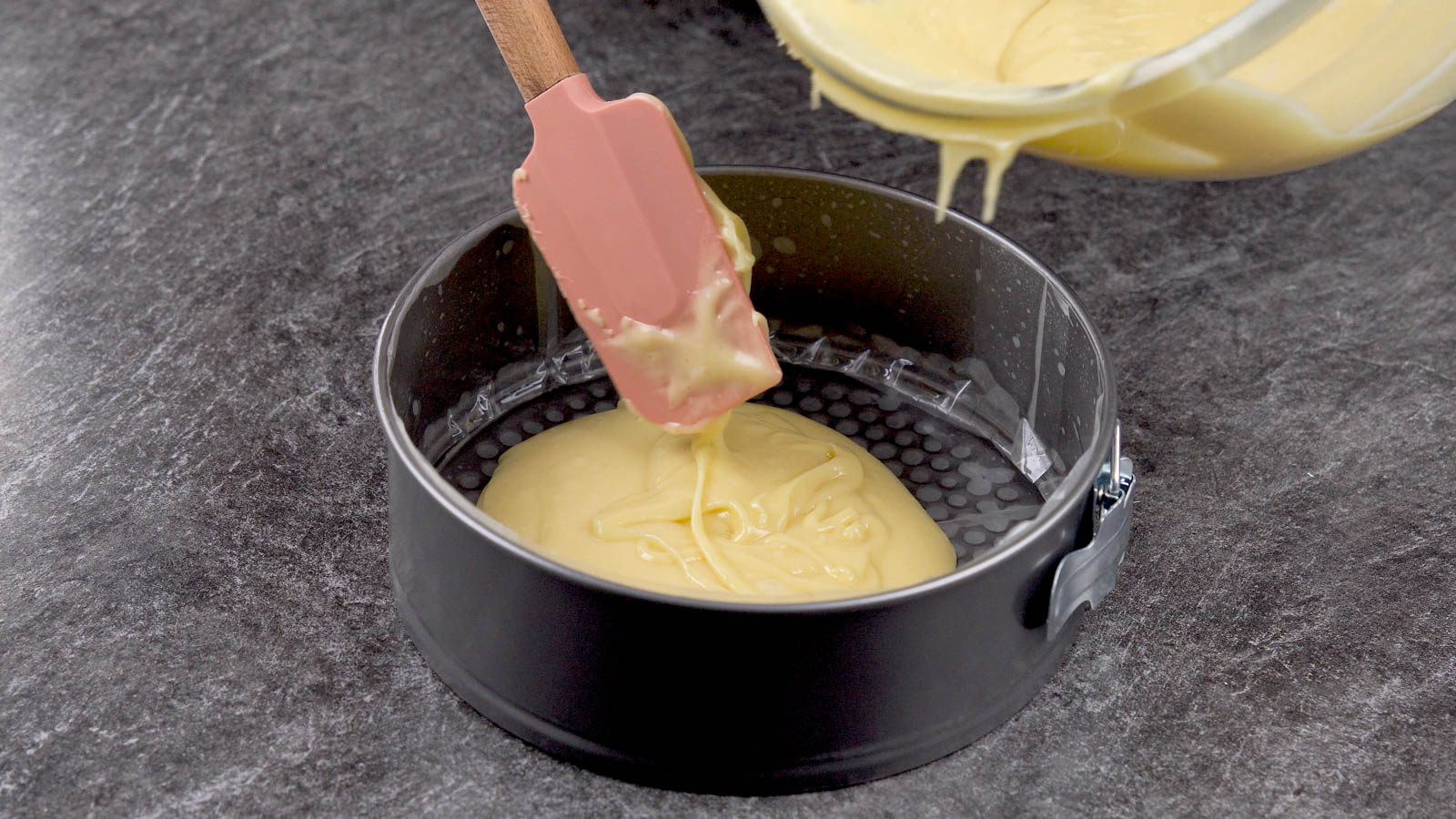 Line a 20 cm springform pan with baking paper. Lightly grease the pan with butter so the paper stays in place and the cake releases easily after baking. Pour half of the batter into the pan and spread evenly.