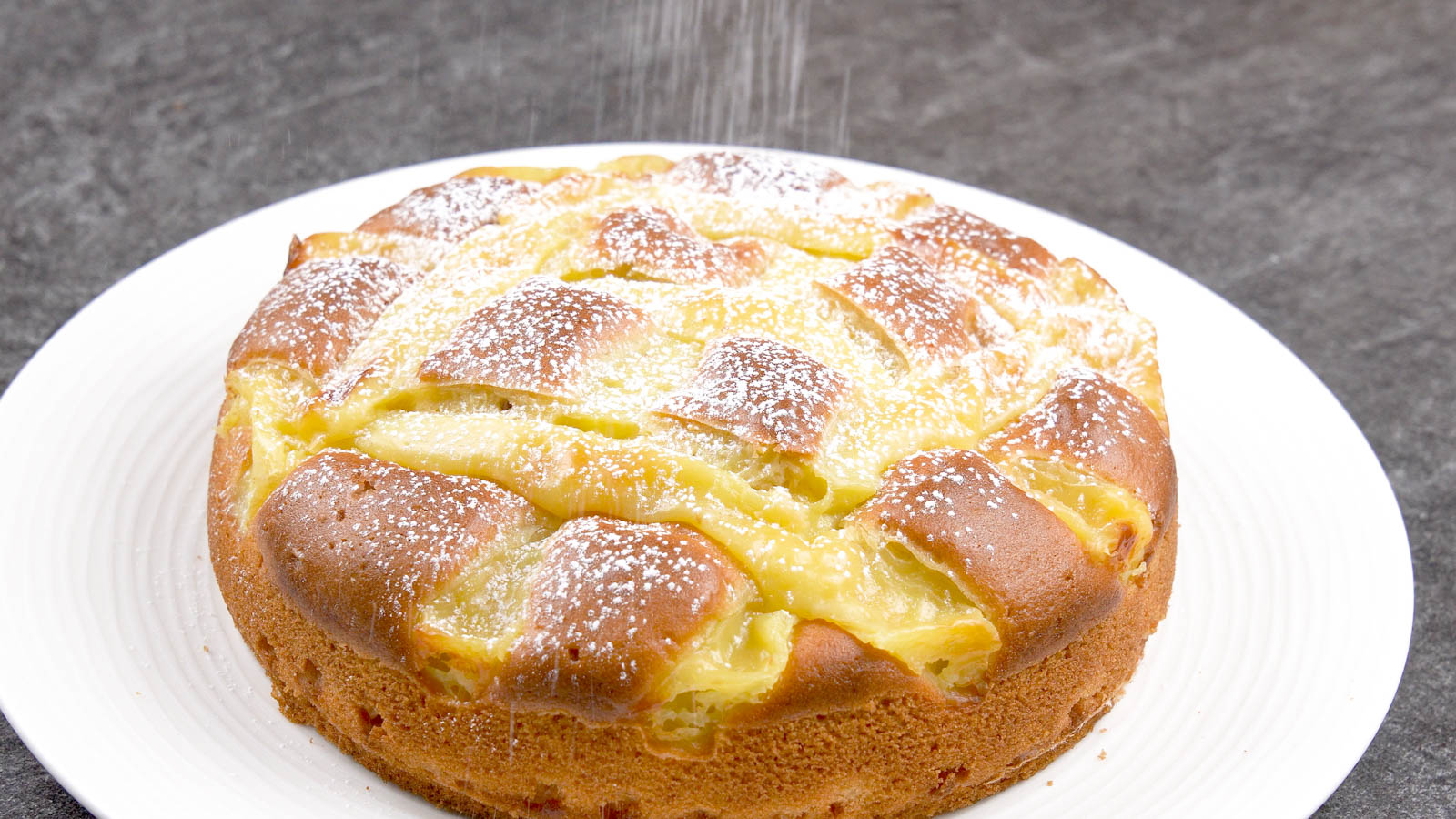 We created this recipe for those moments when you crave a warm, comforting cake but you want to keep things simple. This cake has three different textural elements: light and tender cake at the bottom, creamy, rich custard mixed throughout, and sweet-tart apples in every bite.