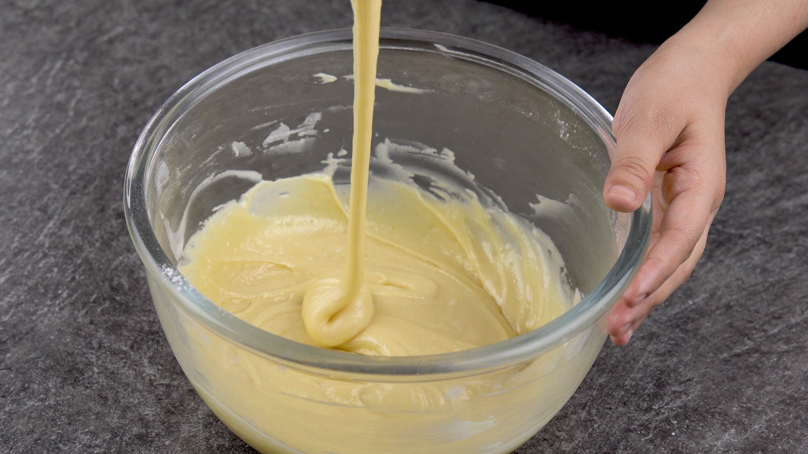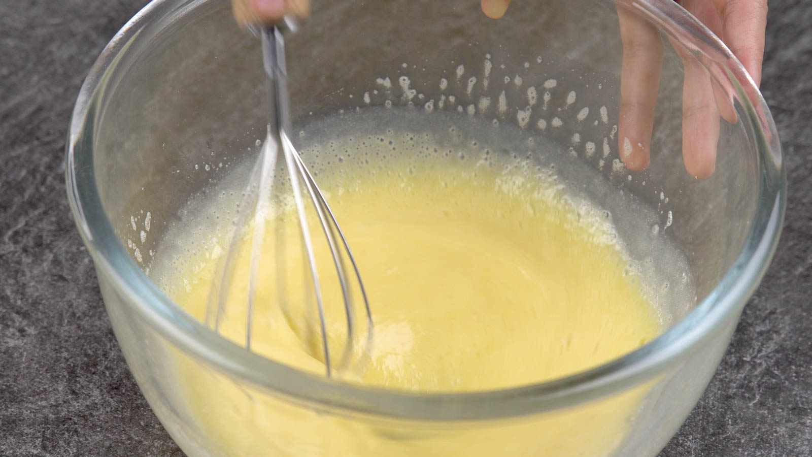 Add the sugar and continue whisking until the mixture becomes pale and slightly thick. Properly whisked eggs create a soft sponge texture.