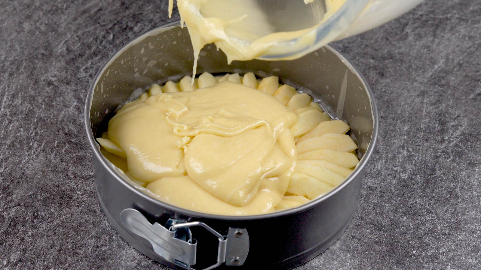 Pour the remaining batter over the apples and gently spread it so the fruit is covered evenly.