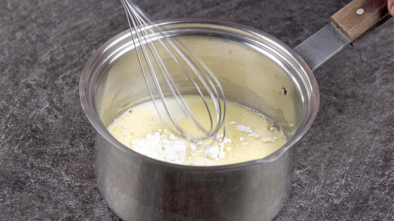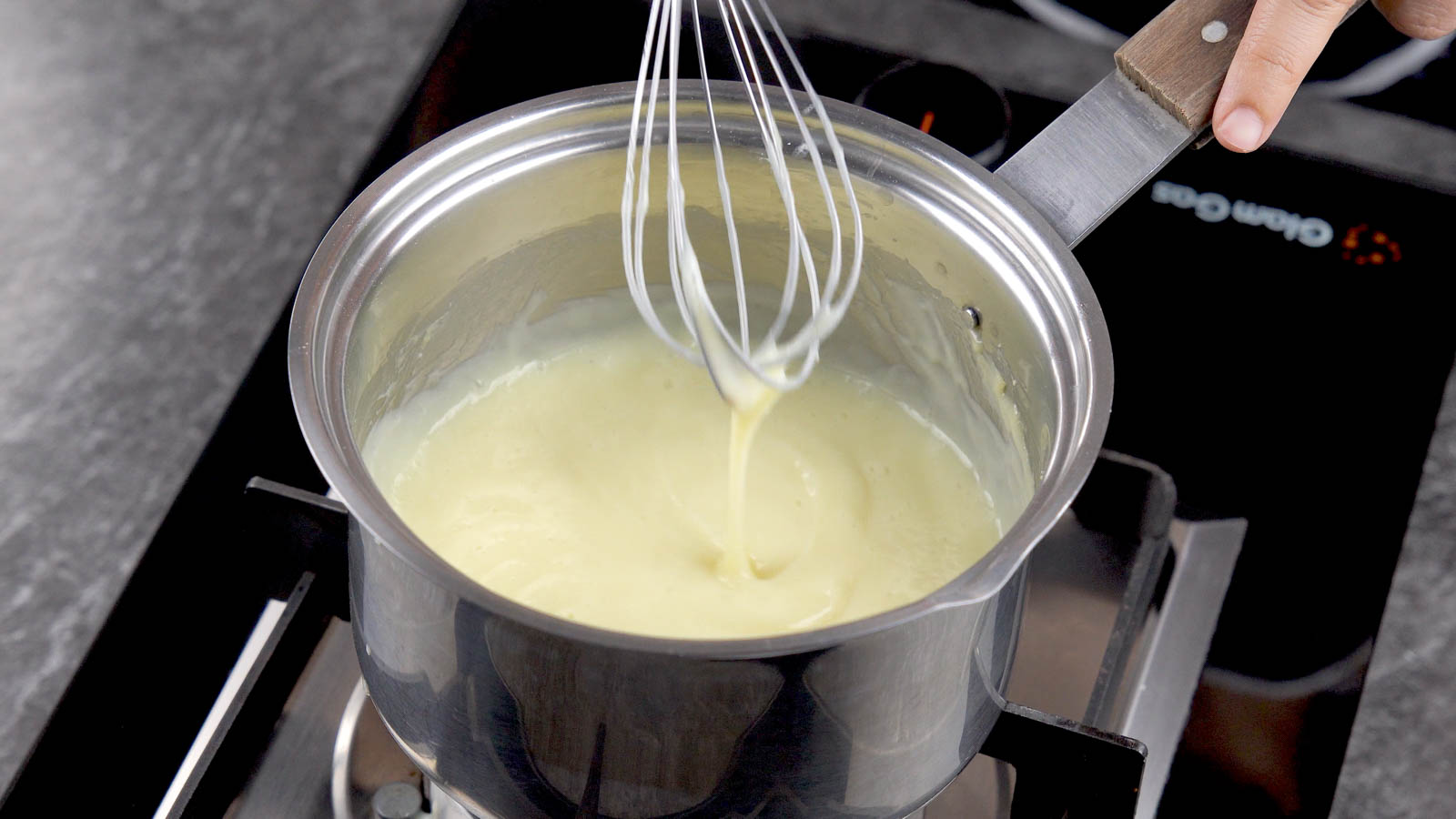 Cook until the mixture thickens into a smooth pudding-like cream. Continuous stirring prevents lumps and stops the cream from sticking to the bottom of the pan.